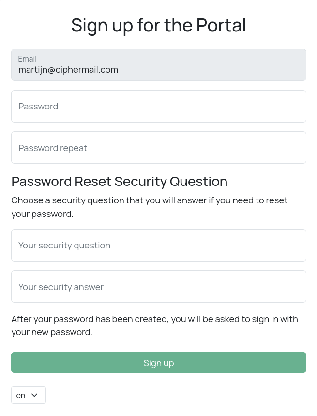 If a portal user has forgotten their password, they can initiate a password reset procedure. The system will send a password reset email containing a link that allows the user to create a new password. To enhance security, the portal may be configured to require users to set up a security question and answer during the initial sign-up process. If this feature is enabled, the user must correctly answer their security question after clicking the reset link before they can choose a new password. This ensures that only the authorized account holder can reset the credentials.