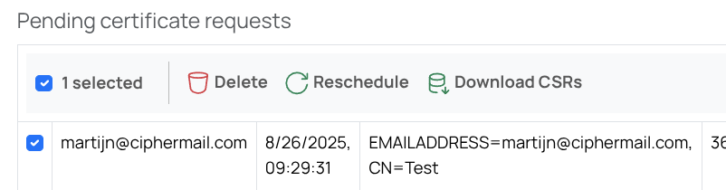 On this page, you will see a list of all encryption certificates currently selected for the user or domain. By default, when a user was selected, the system only displays certificates that include email addresses matching the user.