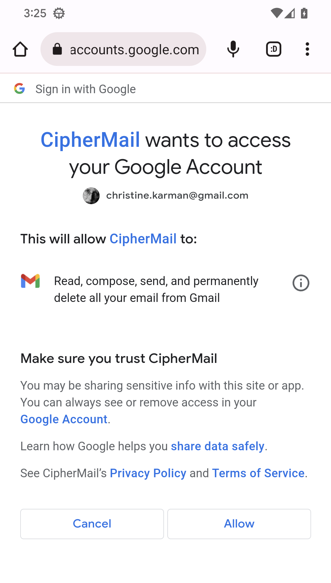 You are asked for confirmation to use this account. After clicking 'Allow', Gmail will allow Ciphermail for Android to use this account for sending email message via Gmail.