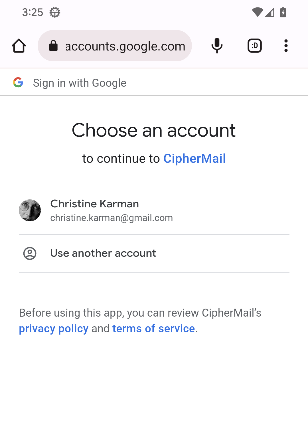 Ciphermail transfers control to the Gmail Oauth page where you can select the Gmail account that you want to use for Ciphermail for Android. Click the appropriate account.