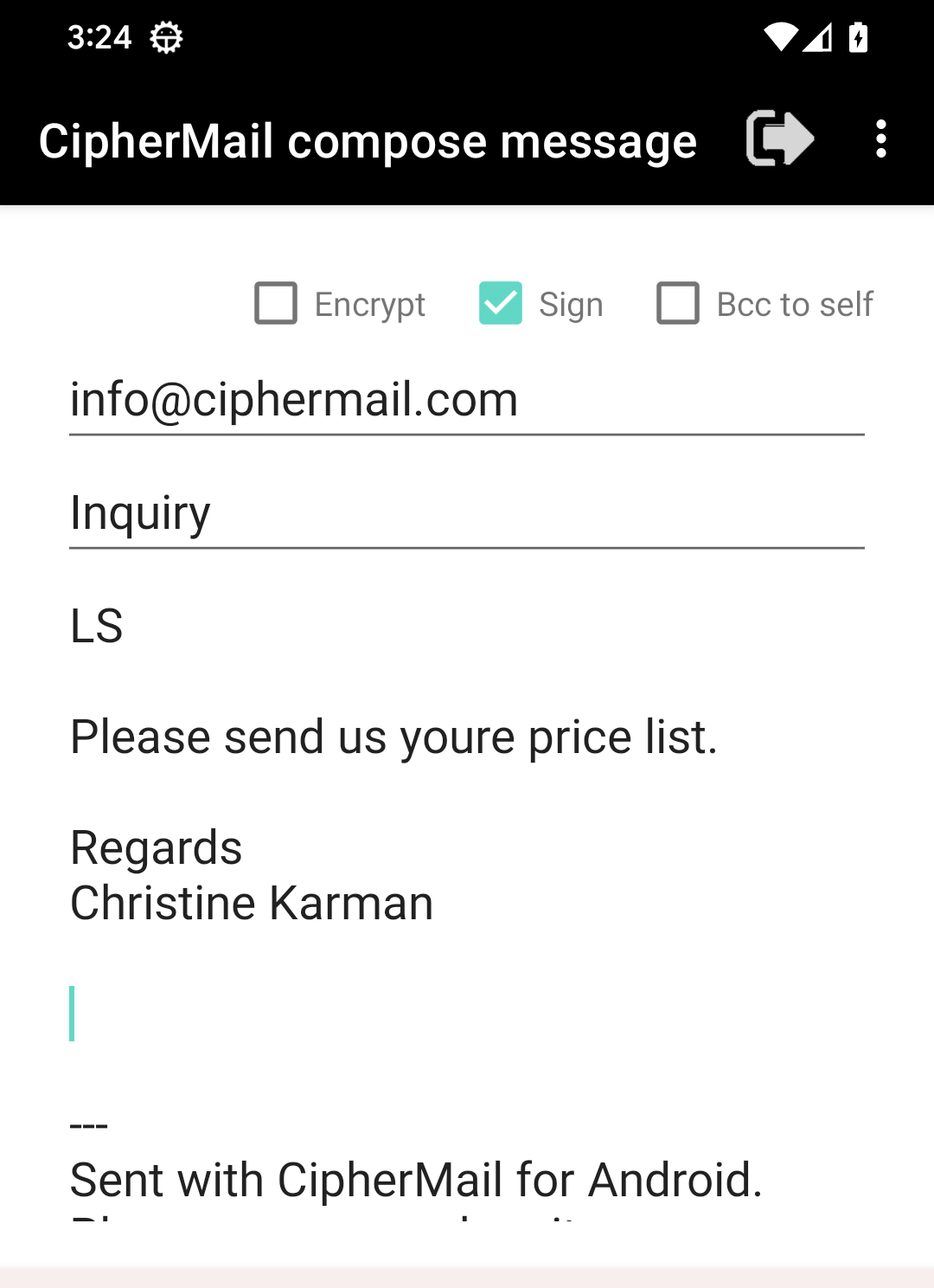You start by composing a message in Ciphermail for Android. In the Main menu, select 'Compose message', you get to the Compose message screen as seen on the rignt.